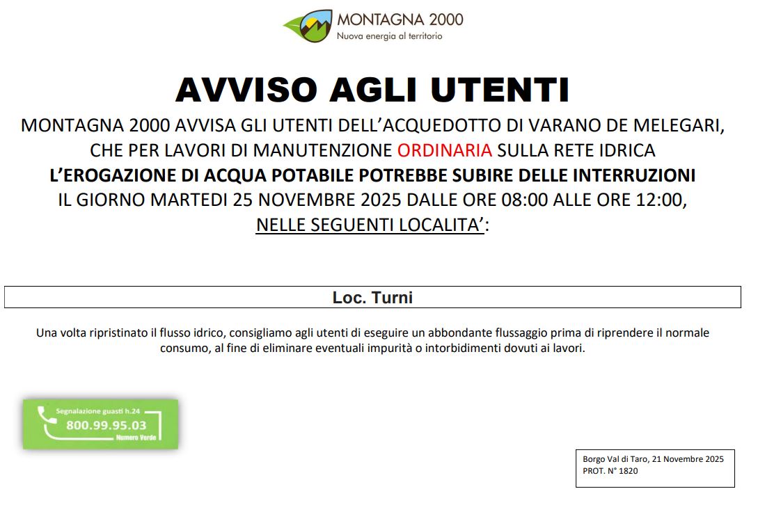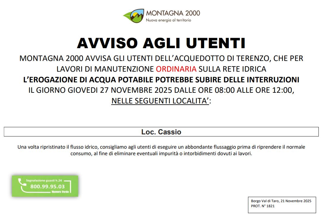MONTAGNA 2000 AVVISA GLI UTENTI DELL’ACQUEDOTTO DI TERENZO, CHE PER LAVORI DI MANUTENZIONE ORDINARIA SULLA RETE IDRICA L’EROGAZIONE DI ACQUA POTABILE POTREBBE SUBIRE DELLE INTERRUZIONI IL GIORNO GIOVEDI 27 NOVEMBRE…