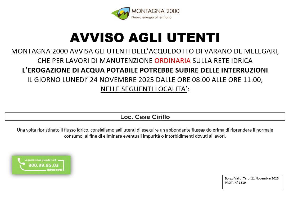 AVVISO AGLI UTENTI MONTAGNA 2000 AVVISA GLI UTENTI DELL’ACQUEDOTTO DI VARANO DE MELEGARI, CHE PER LAVORI DI MANUTENZIONE ORDINARIA SULLA RETE IDRICA L’EROGAZIONE DI ACQUA POTABILE POTREBBE SUBIRE DELLE INTERRUZIONI…