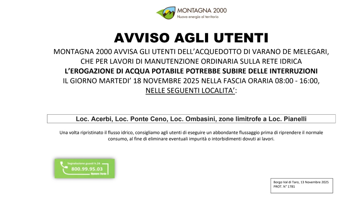 MONTAGNA 2000 AVVISA GLI UTENTI DELL’ACQUEDOTTO DI FORNOVO DI TARO, CHE PER LAVORI DI MANUTENZIONE SULLA RETE IDRICA L’EROGAZIONE DI ACQUA POTABILE SUBIRA’ UN’INTERRUZIONI IL GIORNO MARTEDI’ 4 NOVEMBRE 2025…
