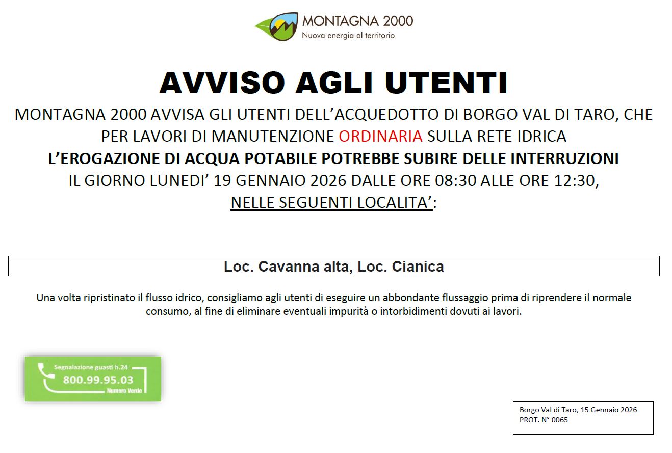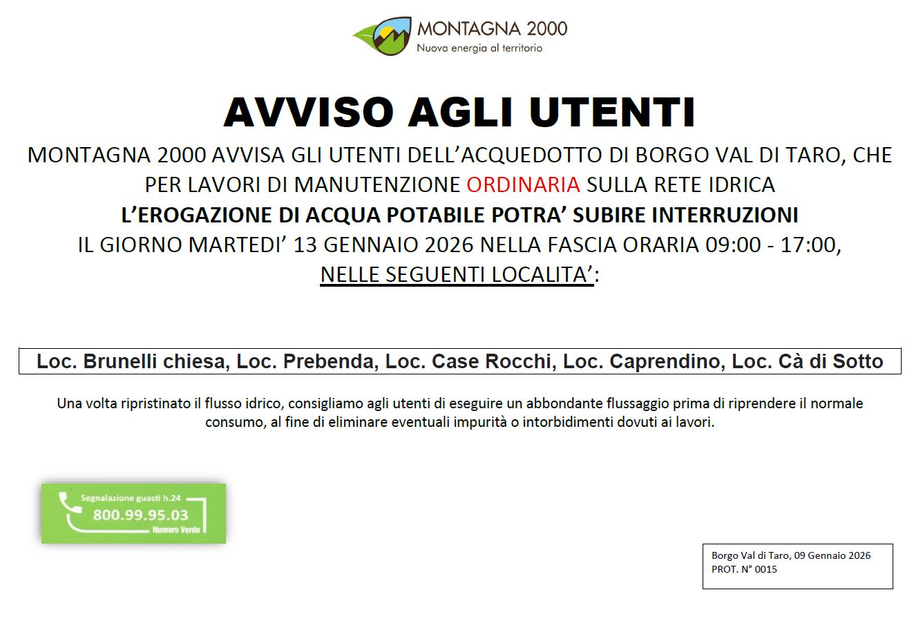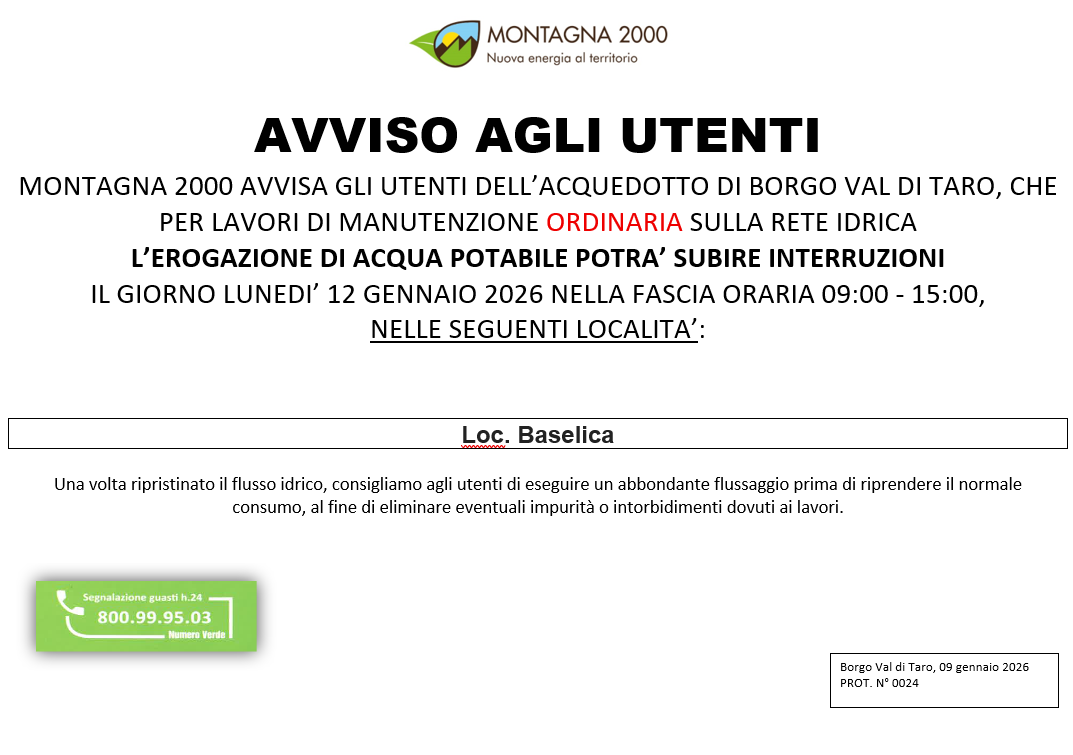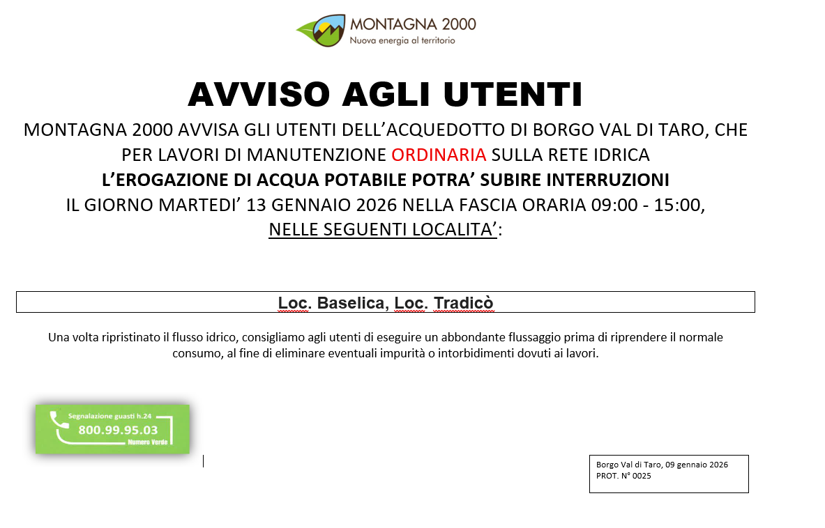 AVVISO AGLI UTENTI MONTAGNA 2000 AVVISA GLI UTENTI DELL’ACQUEDOTTO DI BORGO VAL DI TARO, CHE PER LAVORI DI MANUTENZIONE ORDINARIA SULLA RETE IDRICA L’EROGAZIONE DI ACQUA POTABILE SARA’ INTERROTTA IL…