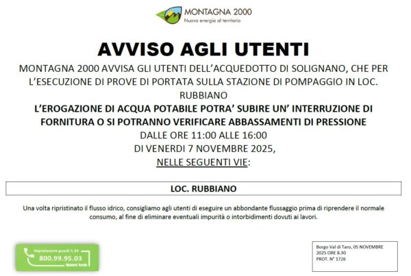 MONTAGNA 2000 AVVISA GLI UTENTI DELL’ACQUEDOTTO DI FORNOVO DI TARO, CHE PER LAVORI DI MANUTENZIONE SULLA RETE IDRICA L’EROGAZIONE DI ACQUA POTABILE SUBIRA’ UN’INTERRUZIONI IL GIORNO MARTEDI’ 4 NOVEMBRE 2025…