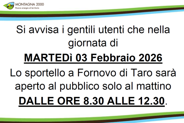 Si avvisa i gentili utenti che nella giornata di MARTEDì 03 Febbraio 2026 Lo sportello a Fornovo di Taro sarà aperto al pubblico solo al mattino DALLE ORE 8.30 ALLE…